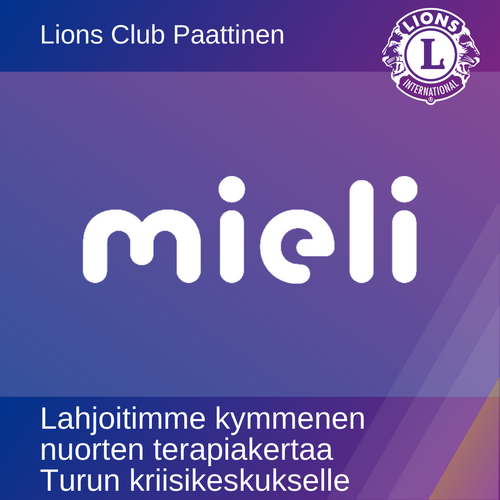 Suomen Lions-liiton ja Mieli - Suomen mielenterveysseuran kumppanuuden myötä klubimme lahjoitti kymmenen nuorten terapiakertaa Turun kriisikeskukselle. Nuorten mielenterveyden haasteet ovat lisääntyneet ja matalan kynnyksen nopeasti tavoittavaa apua tarvitaan jatkuvasti. Lahjoitus välitetään kriisikeskukselle suurempana kertalahjoituksena Lions-piirin Tuki ry:n kautta.