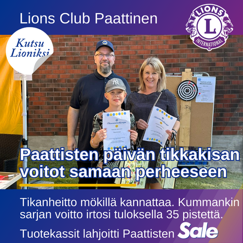 Tikkakisan palkinnot lahjoitti Sale Paattinen. Kiitos erinomaisesta yhteistyöstä grillipisteen ja lionstoiminnan esittelyn toteuttamisessa Sale Paatinen ja Raision tehtaat! Grillipisteen tuotto lahjoitetaan hyväntekeväisyyteen.